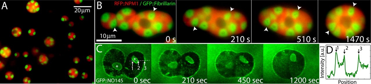 Dynamics of nucleolar substructures. (A) A GV exhibiting GFP∷fibrillarin/RFP∷NPM1�labeled nucleoli. Note that larger nucleoli contain many fibrillarin cores, whereas smaller nucleoli contain only one or two fibrillarin cores. (B) Image sequence showing fusion of several GFP∷fibrillarin/RFP∷NPM1-labeled nucleoli. Arrowheads track the positions of two fibrillar cores. (C) Image sequence showing the dynamics of GFP∷NO145 at the cortex of two fusing nucleoli. Note the GFP∷NO145 localization to the interior of nucleoli at the surface of nucleolar vacuole-like structures (*). (D) Intensity profile across the dotted line shown in C; peaks 1 and 2 reflect vacuolar surface, and peak 3 reflects nucleolar cortex.