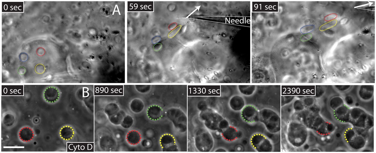 The role of a surrounding actin scaffold in slowing internucleolar contact. (A) Pulling on one region of the GV with a microneedle displaces nucleoli in distal regions, suggesting the presence of an elastic scaffold. Four nucleoli are highlighted. (B) GV treated with Cyto-D to disrupt filamentous actin. Nucleoli freely diffuse throughout the GV and fuse with one another upon contact; the fates of three nucleoli are highlighted. One large nucleolar clump results; note, however, that under these drug conditions nucleoli do not appear to regain sphericity and fusion appears perturbed.