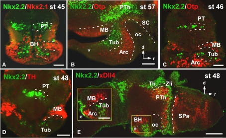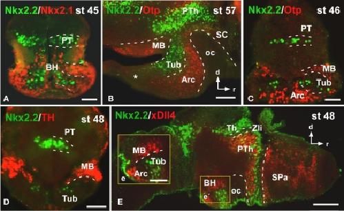 Figure 3. Photomicrographs of transverse (A,C,D) and sagittal (B,E) sections through the basal hypothalamus illustrating the Nkx2. 2 expression in combination with several hypothalamic markers. The Nkx2.1 expression confirms that the limited Nkx2.2 expression found in the basal hypothalamic territory is situated in the tuberal region (A), restricted to the anterior part [asterisk in (B)] and avoiding the nucleus arcuatus, labeled for Otp (B,C), and the mammillary band, defined by TH (D) and xDll4 (E,E′). Yellow box in e indicates the area shown in higher magnification in e′. Abbreviations as in Figure 1. Scale bars: 100 μm (B,E), 50 μm (A,C,D,E′). |