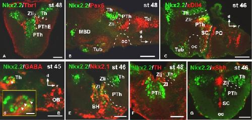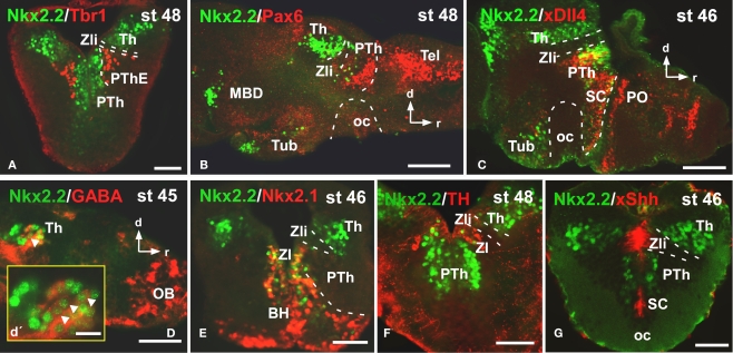 Figure 4. Photomicrographs of transverse (A,E,F,G) and sagittal (B,C,D) sections through the diencephalon illustrating the Nkx2. 2 expression in combination with diverse diencephalic markers. The prethalamic eminence, rich in Tbr1 (A), was devoid of Nkx2.2 expression, in contrast to the prethalamus, defined by the Pax6 (B) and xDll4 expressions (C). The yellow box in d shows a higher magnification of the Nkx2.2/GABA double labeled cells found in the thalamus [see arrowheads in (D,D′)]. The double labeling Nkx2.2/Nkx2.1 (E) and Nkx2.2/TH (F) define the position of the Nkx2.2 cells in the zona incerta of the prethalamus. The xShh diencephalic expression defines the lack of Nkx2.2 expression in the Zli (zona limitans intrathalamica) (G). Abbreviations as in Figure 1. Scale bars: 100 μm (B,C,D), 50 μm (A,E,F,G), 25 μm (D′). |