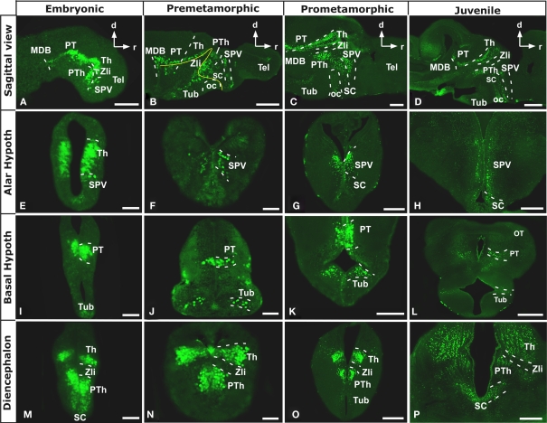 Figure 1. Photomicrographs of sagittal (AâD) and transverse (EâP) sections through the Xenopus forebrain subdivisions along the different representative developmental stages. The sagittal sections show the almost continuous Nkx2.2 expression from anterior hypothalamic areas to the most caudal regions of the forebrain (AâD). Nkx2.2 is not expressed in telencephalic areas, from embryonic stages through the adult. Nkx2.2 expression starts in the SPV territory of the alar hypothalamus (EâH). In the basal hypothalamus Nkx2.2 expression is restricted to the tuberal hypothalamus (IâL). In the diencephalon, Nkx2.2 is observed in the three prosomeres (P1âP3) and the Zli lacks Nkx2.2 expressing cells (IâP). Abbreviations: Arc, nucleus arcuatus; BH, basal hypothalamus; MB, mammillary band; MDB, midbrain-diencephalic boundary; OB, olfactory bulb; oc, optic chiasm; OT, optic tectum; P1-P3, diencephalic prosomeres 1â3; Pa, pallium; POC, preoptic commissural area/commissural septo-preoptic area; PO, preoptic area; PT, pretectum; PTh, prethalamus; PThE, prethalamic eminence; PV, paraventricular nucleus; SC, suprachiasmatic nucleus; SPa, subpallium; SPV, supraopto-paraventricular area; Tel, telencephalon; Th, thalamus; TP, posterior tubercle; Tub, tuberal area; ZI, zona incerta; Zli, zona limitans intrathalamica. Scale bars: 500âμm (D,L), 200âμm (C,G,H,K,O,P), 100âμm (A,B), and 50âμm (E,F,I,J,M,N). |