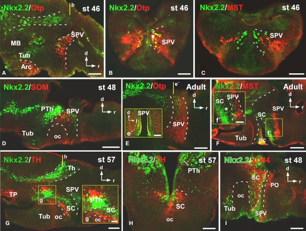 Figure 2. Photomicrographs of sagittal (A,D–G,I) and transverse (B,C,E′,H) sections through the alar hypothalamus illustrating the Nkx2. 2 expression in combination with several hypothalamic markers. The most anterior Nkx2.2 expressing cells are observed in the SPV (the Otp expressing territory) during development (A,B,E,E′), in the region where it colocalizes with mesotocin (C,F,F′) and somatostatin (D), but only a subpopulation of the SPV cells coexpress Nkx2.2 and Otp [see arrow in (B,E,E′)]. At suprachiasmatic levels, the Nkx2.2 positive cells are located in the catecholaminergic (G,G′,H) and xDll4 (I) expressing region, constituting an independent territory within this domain (G–I). The yellow lines in (A,E,G) indicate the level of the sections of (B,E′,H), respectively. Yellow boxes in (F,G) indicate the higher magnifications shown in (F′,G′), respectively. Abbreviations as in Figure 1. Scale bars: 500 μm (F), 200 μm (E,E′,G), 100 μm (D,H) and 50 μm (A,B,C,F′,G′,I). |