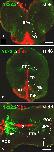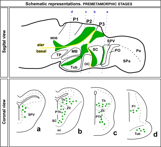 Figure 6. Schematic drawings of sagittal and coronal sections through a premetamorphic brain of Xenopus laevis illustrating the distribution of Nkx2. 2 expressing zones (green regions in the sagittal view) and cells (green dots in the coronal view) along the forebrain. The appropriated levels of the coronal sections are indicated in the sagittal view. Abbreviations as in Figure 1. |