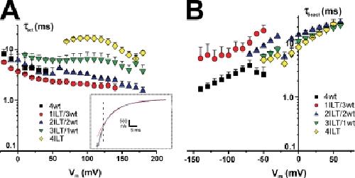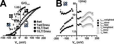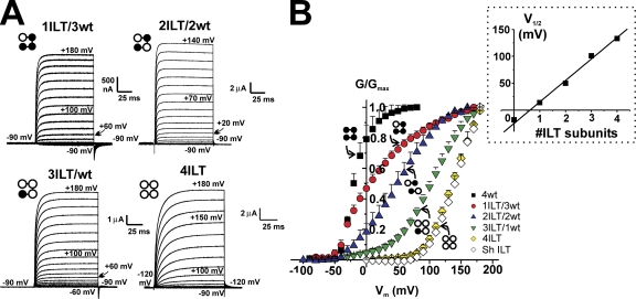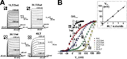The contribution of individual subunits to the coupling of the voltage sensor to pore opening in Shaker K channels: effect of ILT mutations in heterotetramers.