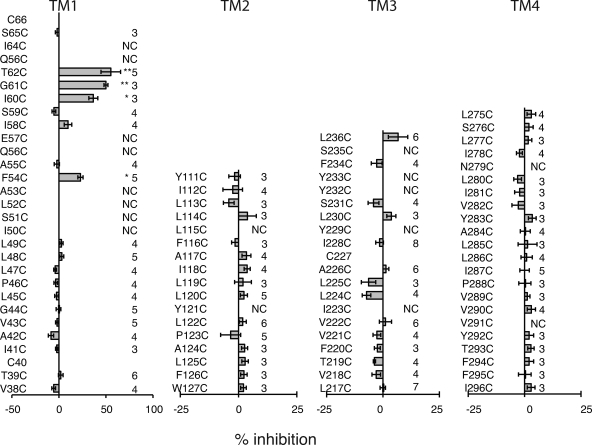 Figure 5. SCAM analysis of the four TM segments of Panx1, with MBB as thiol reagent. The amino acids are arranged in ascending order for TM1 and TM3 and in descending order for TM2 and TM4 to reflect their directional orientation in the membrane. Means ± SE of irreversible current inhibition by 100 µM MBB are plotted. The number of oocytes analyzed is indicated on the right. NC, no channel activity was detected. *, P < 0.05; **, P < 0.01 (vs. Panx1 C426S control).