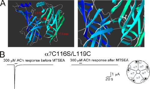 Figure 1. Location of the L119 residue in a homology model of α7 (Celie et al., 2004). (A) The overview at left shows an α7-α7 homodimer and the location of the L119 residue in relation to the C-loop in the primary face of the agonist binding site. The image on the right shows the proximity at increased magnification. Images were created in Deep View (Swiss-PdbViewer; Guex and Peitsch, 1997) from the crystal structure model of the ACh binding protein (deposited in the Protein Data Bank under accession no. 1I9B; Brejc et al., 2001). (B) The effect of MTSEA treatment (2 mM for 60 s) on the ACh-evoked responses of oocytes expressing the α7L119C mutation in a cysteine-null (α7C116S) background. In this experiment, peak current responses to 300 µM ACh were reduced 99.4 ± 0.2%, and net charge was reduced by 99.7 ± 0.1% (n = 4). Responses to 3 mM ACh were reduced to a similar extent: 97.9 ± 0.3 and 95.9 ± 2.0% for peak current and net charge, respectively (n = 4).