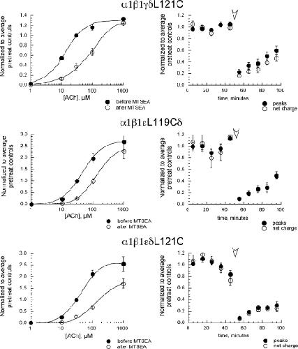 Figure 5. ACh concentration–response data for muscle-type single-subunit mutants before and after MTSEA treatment. Oocytes were stimulated alternately with control applications of 30 µM ACh and ACh at increasing concentrations: 1 µM, 10 µM, 100 µM, and 1 mM (i.e., the sequence of applications was 30, 1, 30, 10, 30, 100, 30, 1,000, and 30). Next, the oocytes were treated with 2 mM MTSEA for 60 s before being tested with the same sequence of ACh applications. All of the data were normalized to the individual oocytes’ average responses to the five 30-µM ACh applications given before the MTSEA treatment. Therefore, the 30-µM point in the pretreatment data is fixed at 1, and the SEM plotted for that point is the average SEM of the five 30-µM responses obtained from each cell. The 30-µM point in the post-MTSEA curve is based on the responses to 30 µM ACh obtained between the posttreatment 10-µM ACh and 100-µM ACh applications. The plots on the right represent the repeated 30-µM ACh responses obtained through the course of the entire experiments, normalized to the average pre-MTSEA 30-µM ACh responses from each cell. The arrowhead indicates the point at which MTSEA was applied. The values plotted are the means ± SEM of five, three, and eight oocytes for α1β1γδL121C, α1β1εL119Cδ, and α1β1εδL121C, respectively. Fit parameters are listed in Table II.
