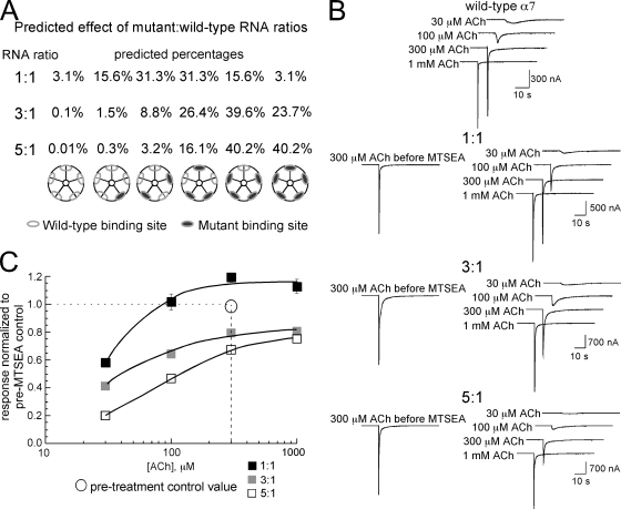 Figure 2. Coexpression of either L119C or Y188F with wild-type α7 subunits at varying ratios. (A) The probability for the distribution of mutant subunits based on RNA ratios. Each single subunit within a pentamer is either mutant or wild-type, and if we assume X = probability of being wild-type (actually α7C116S) and Y = probability of being mutant, then 1 = X + Y, and for combinations of five subunits, (X + Y)n = 1. The expansion of this binomial is X5 + 5X4Y + 10X3Y2 + 10X2Y3 + 5XY4 + Y5 = 1. We assume that receptors are functionally equivalent regardless of the subunit positions within the pentameric structure. (B) Data traces obtained from oocytes expressing the α7C116S/L119C MTSEA-sensitive mutant and the α7C116S cysteine-null pseudo wild-type at the ratios indicated. For each panel, the traces on the left are the 300-µM ACh control responses obtained before the MTSEA treatment, and the series of traces on the right are the responses to progressively greater concentrations of ACh obtained after the MTSEA treatment. (C) Average net charge values for oocytes expressing the α7C116S/L119C MTSEA-sensitive mutant and α7C116S cysteine-null pseudo wild-type at the ratios indicated after treatment with MTSEA, normalized to the 300-µM ACh control responses before MTSEA treatment. The open circles represent the 300-µM ACh control data obtained before the MTSEA treatment (i.e., the values to which the posttreatment data are normalized). The data plotted are the means ± SEM for at least five oocytes at each of the ratios tested. See Table I for curve fit values.