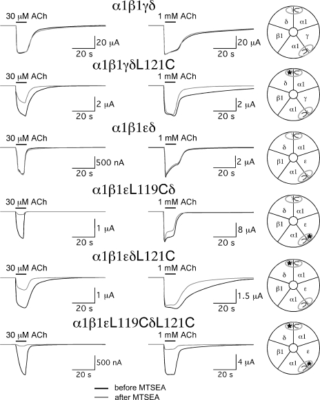 Figure 4. The effect of MTSEA on muscle-type receptors with mutations homologous to α7L119C in muscle δ, γ, and ε subunits. Representative responses obtained before MTSEA treatments are shown as black lines, and responses obtained after MTSEA are shown as gray lines. The schematics to the right of the traces represent the subunit composition and disposition of the ACh binding sites for the different receptor subtypes. The asterisks represent the location of the mutations in the complementary face of the agonist binding site.
