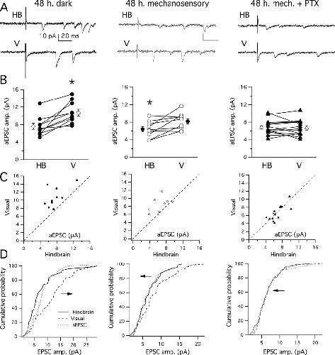 Figure 2. Modality-specific changes in aEPSC amplitude after various sensory manipulations(A) aEPSCs evoked by visual or hindbrain stimulation after 48 hours of visual deprivation (left), enhanced mechanosensory stimulation (middle) or enhanced mechanosensory stimulation in the presence of inhibitory blockers (right). (B) Comparison of hindbrain and visual stimulation after various experimental conditions. Symbols next to paired data represent average values and error bars are SEM. (C) Scatterplot of aEPSC amplitude evoked by each pathway after various experimental conditions. (E) Cumulative probability distribution of aEPSC amplitudes from both pathways superimposed with spontaneous EPSC (sEPSC) amplitudes after various experimental conditions. Stars indicate p<0.05.