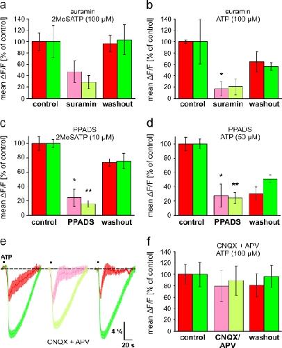 Fig. 4. Effects of purinergic and glutamatergic antagonists on nucleotide-induced [Ca2+]i increases in cells of the anterior telencephalon. a Mean peak responses (±SEM), expressed as percent of control response to 2MeSATP (100 μM), of 186 OB cells and 80 PVZ cells (three slices of the anterior telencephalon) in control conditions (red and green columns on the left-hand side, respectively), after 10 min in bath solution with 200 μM suramin (light red and light green column, respectively), and after 10 min of washout with bath solution (red and green columns on the right-hand side, respectively). b Same representation as in a with ATP (100 μM) and suramin [200 μM; 90 OB cells and 72 PVZ cells (two and three slices of the anterior telencephalon, respectively)]. c Same representation as in a with 2MeSATP (10 μM) and PPADS [200 μM; 155 OB cells and 216 PVZ cells (two slices of the anterior telencephalon)]. d Same representation as in a with ATP (50 μM) and PPADS [200 μM; 242 OB cells and 262 PVZ cells (three slices of the anterior telencephalon)]. e The peak amplitudes of ATP-induced (100 μM) mean [Ca2+]i transients (±SEM) of all responsive cells (OB: n = 21, red traces; PVZ: n = 47, green traces) of an individual slice of the anterior telencephalon are not significantly attenuated by 50 μM CNQX and 200 μM APV (OB: light red trace; PVZ: light green trace). f Mean peak responses (±SEM), expressed as percent of control response to ATP (100 μM), of 287 OB cells and 360 PVZ cells (seven slices of the anterior telencephalon) in control conditions (red and green columns on the left-hand side, respectively), after 5 min in bath solution with 50 μM CNQX and 200 μM APV (light red and light green column, respectively), and after 10 min of washout with bath solution (red and green columns on the right-hand side, respectively). (*p < 0.05 and **p < 0.01; unpaired t test) |