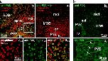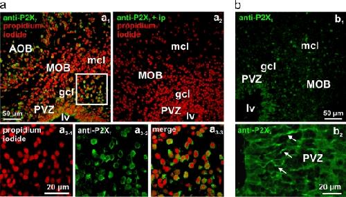 Fig. 7. Distribution of P2X7- and P2X4-like immunoreactivity in the anterior telencephalon. a Immunoreactivity to a P2X7 antibody (green fluorescence) and cell nuclei staining with propidium iodide (red fluorescence) of a slice of the anterior telencephalon is shown in a1. Another slice treated with the anti-P2X7 antibody after preadsorption with the immunizing protein and counterstained with propidium iodide is shown in a2. Higher magnification of the region indicated by the white rectangle in a1 is shown in a3-1âa3-3. Note the clear somatic staining pattern of OB cells. b Immunoreactivity to a P2X4 antibody (b1) of another slice of the anterior telencephalon. Higher magnification of the P2X4-like immunoreactivity of the PVZ (b2). Note the stained tubular structures starting from the lateral ventricle and extending towards the OB (see arrows). Abbreviations: MOB main olfactory bulb, AOB accessory olfactory bulb, PVZ periventricular zone, lv lateral ventricle, mcl mitral cell layer, gcl granule cell layer |