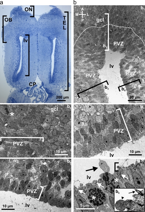 Fig. 1. Ultrastructural analysis of the anterior telencephalon. a Horizontal slice of the telencephalon of larval X. laevis stained with Methylenblue-Azur II. b Transmission electron microscopy of the anterior part of the lateral telencephalic ventricles with its PVZ and the posterior part of the granule cell layer of the OB (b1). Various electron micrographs were assembled into a photo montage to obtain this overview. The dotted line indicates the approximate border between the PVZ and the granule cell layer of the OB. The brackets indicate the approximate location of the areas shown at higher magnification in b2 through b4. Anterior part of the PVZ and adjacent granule cell layer of the OB (b2). Cell divisions are frequent in the PVZ. Note the cell with decomposed nuclear envelope and condensed DNA in form of chromosomes (asterisk). Medial part of the PVZ (b3) and lateral part of the PVZ (b4). The brackets in b2through b4 include the cell layers of the anterior, medial, and lateral PVZ, respectively. b5 shows a higher magnification of cells in direct contact with the lumen of the lateral ventricles. Two cells are in mitosis (asterisks). The white arrows indicate accumulations of mitochondria very close to the ventricular lumen. The black arrow shows a large cellular protrusion into the ventricle. The area included in the bracket is shown at higher magnification in b6. Note the multivesicular protrusion into the ventricle (arrowhead) and the single cilium extending into the cerebrospinal fluid (arrow). Abbreviations: ON olfactory nerve, OB olfactory bulb, PVZ periventricular zone, TEL telencephalon, CP choroid plexus, lv lateral ventricle, gcl granule cell layer |