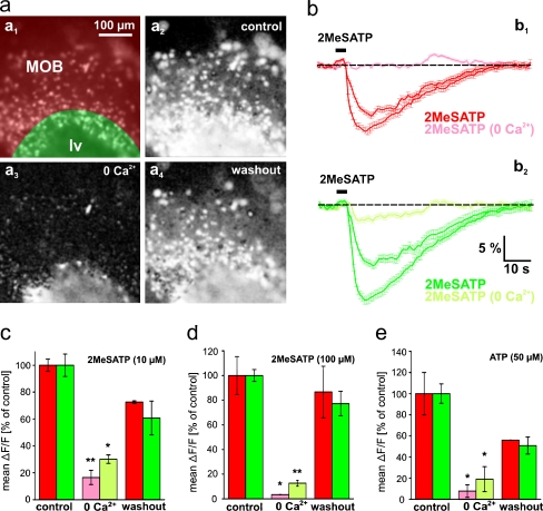 Fig. 5. Nucleotide-induced responses of OB and PVZ cells are differentially affected by omission of extracellular Ca2+. a Fura-2/AM stained acute slice preparation of the anterior telencephalon (a1; image acquired at rest). The area of the OB is shaded in red, and the area of the PVZ is shaded in green. Pixel correlation maps of the same slice (see âMaterials and methodsâ section for details) obtained upon application of 2MeSATP (100 μM; a2 standard bath solution; a3 application after 10 min in Ca2+-free bath solution; a4 application after returning to standard bath solution). b The corresponding 2MeSATP-induced mean [Ca2+]i transients (±SEM) of all clearly identifiable responsive cells of the OB [b1red traces: in normal bath solution (before and after application of Ca2+-free bath solution); light red traces: after 10 min in Ca2+-free bath solution; nâ=â82 cells] and of the PVZ [b2green traces: in normal bath solution (before and after application of Ca2+-free bath solution); light green traces: after 10 min in Ca2+-free bath solution; nâ=â59 cells]. c Mean peak responses (±SEM), expressed as percent of control response to 2MeSATP (10 μM), of 161 OB cells and 182 PVZ cells (two slices of the anterior telencephalon) in control conditions (red and green columns, respectively) and after 10 min in Ca2+-free bath solution (light red and light green column, respectively). d Same representation as in C with 2MeSATP [100 μM; 205 OB cells and 105 PVZ cells (two slices of the anterior telencephalon)]. e Same representation as in C with ATP [50 μM; 161 OB cells and 182 PVZ cells (two slices of the anterior telencephalon)]. (*pâ<â0.05 and **pâ<â0.01; unpaired t test). Abbreviations: MOB main olfactory bulb, lv lateral ventricle |