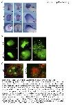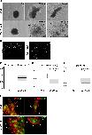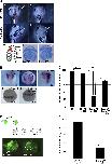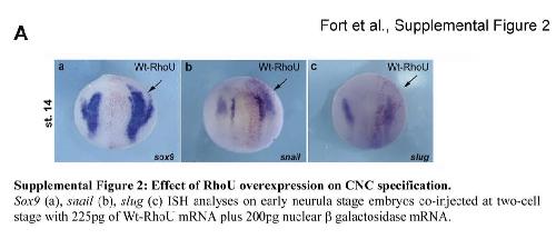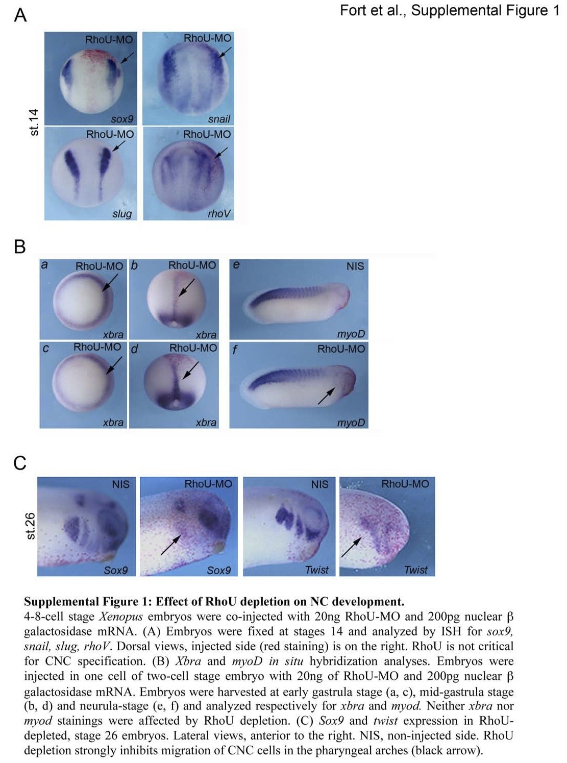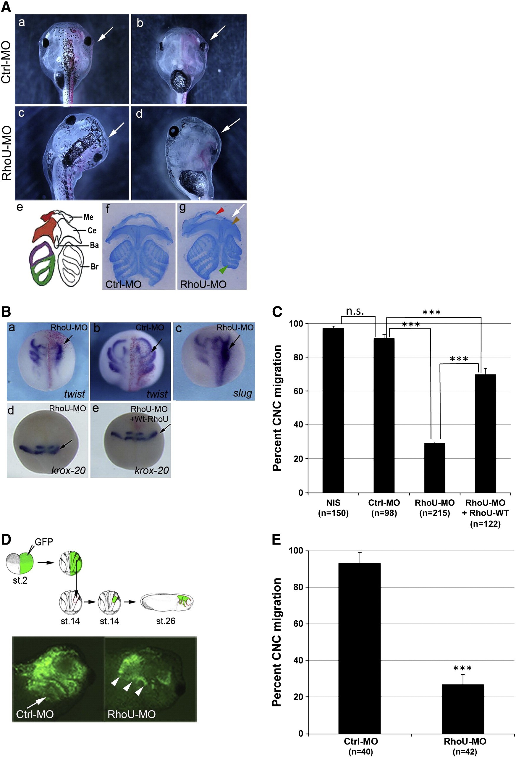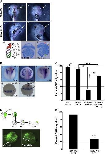 Fig. 2. rhoU mRNA is expressed in Xenopus migrating CNC cells and is required for migration. (A) RhoU knock-down elicits the loss of neural crest derivatives. 4 cell stage Xenopus embryos were injected with nuclear β-galactosidase mRNA plus control MO (Ctrl-MO) or RhoU-MO and then fixed at stage 45. Shown are Ctrl-MO (a, b) and RhoU-MO-injected embryos (c, d) representative of the observed skeletal defects. Dorsal views (a, c), ventral views (b, d). The injected side is on the right, as monitored by the co-injected β-galactosidase mRNA lineage tracer (red staining) and indicated by white arrows. (e) Drawing of ventral cranial cartilages modified from Sadaghiani and Thiebaud (1987) and Spokony et al. (2002). Neural crest derived cartilages are marked as: Me, Meckel's cartilage; Ce, cerathoyal cartilage; Ba, basihyal cartilage; Br, branchial/gill cartilage. (f, g) Skeletal structures from Ctrl-MO (f) and RhoU-depleted (g) stage 45 tadpoles were stained with alcian blue on flat-mount embryos. Arrows in g use the same color code as in e. (B) RhoU knock-down impairs CNC cell migration. 4-cell stage embryos were co-injected into a single cell with nuclear β-galactosidase mRNA plus control MO (Ctrl-MO) or RhoU-MO. Dorsal views of stage 22 embryos, injected sides (red staining) are on the right. (a) Twist and (c) slug and stainings on RhoU-MO injected embryos. (b) Twist staining on control MO (Ctrl-MO) injected embryo. RhoU depletion inhibits CNC cell migration into pharyngeal arches (black arrows). (c) Krox-20 ISH showed that CNC cells did not migrate into the third branchial arch in RhoU-MO morphants, while expression in the hindbrain was not affected. (d) Co-injection of 200 pg GFP-Wt-RhoU mRNA, insensitive to RhoU-MO, rescued CNC cell migration, as evidenced by the krox-20 staining in the third branchial arch (black arrow). (C) Graph summarizing the results of three independent injection experiments as described in B. NIS, non-injected control side; Ctrl-MO, control side injected with control MO; n, total number of embryos analyzed. *** indicates conditions statistically different (pb0.001). (D) RhoU function in the CNC cell is cell-autonomous. 4-cell stage embryos Xenopus embryos were injected in one cell with 300 pg GFP mRNA plus control MO (Ctrl-MO) or RhoU- MO. At early neurula stages, correctly targeted embryos were identified using a fluorescence-equipped dissecting microscope. CNC explants were then grafted into uninjected control embryos, as schematized. CNC cell migration was normal in GFP grafts (white arrow) while it was impaired in RhoU-depleted grafts (white arrowheads). (E) Graph summarizing the results of three independent graft experiments as described in D. NIS, non-injected-side; n, total number of embryos analyzed. *** indicates conditions statistically different (pb0.001). |