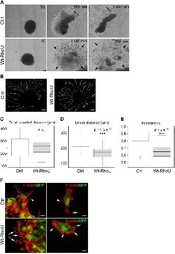 Fig. 6. RhoU regulates the directionality of CNC cell migration in vitro. Embryos were injected with 300 pg GFP mRNA alone (control, Ctrl) or with 225 pg Wt-RhoU mRNA. At stage 17, CNC explants were excised and plated on fibronectin-coated substrates. (A) Time-lapse microscopy images of explants at plating (T 0) and 3 (T 180 min) and 6 h (T 360 min) thereafter. Arrows in the top panels indicate the preferential direction of migration of control CNC cells, while arrowheads in the bottom panels illustrate the multiple directions followed by RhoU-expressing cells. (B) Behavior of labeled cells in CNC explants was recorded by time-lapse movies. Paths followed by control and Wt-RhoU expressing cells during a 6-hour migration. Bar, 20 μM. (C, D, E) Trajectories of individual cells from two control (Ctrl) explants (n1 = 21 and n2 = 22) and three Wt-RhoU expressing explants (n1 = 21, n2 = 23 and n3 = 23) were tracked. Total distance traveled (C), linear distance traveled (D) and persistence index (E) were calculated. Graphs show box-and-whiskers plots for all conditions. *** indicates statistically significant differences. n.s.: not significant. (F) Analysis of CNC cell protrusions. Staining for GFP (green) and F-actin (red) were merged. Left panels show cells located at the explant border while right panels show individual motile cells. Arrows point to lamellipodia and arrowheads indicate filopodia. Wt-RhoU expressing cells shown are representative of 72% observed cells (n = 160). Bar, 10 μM. |