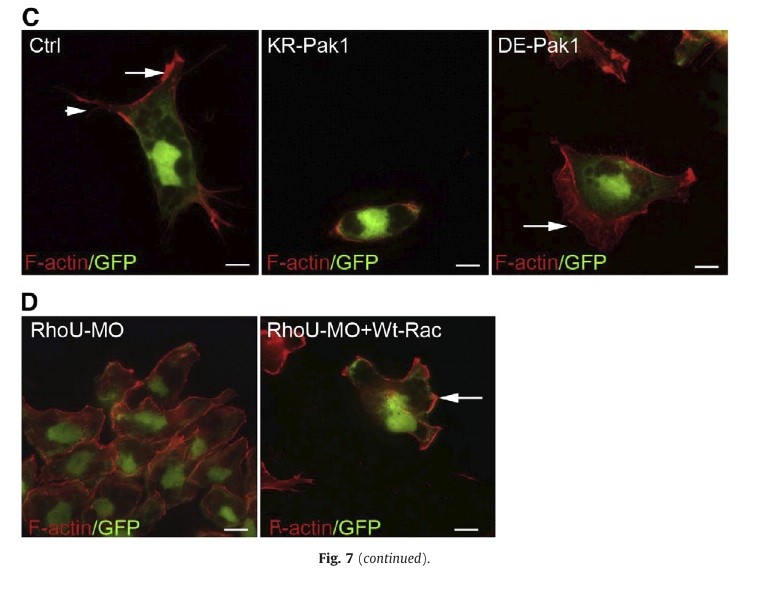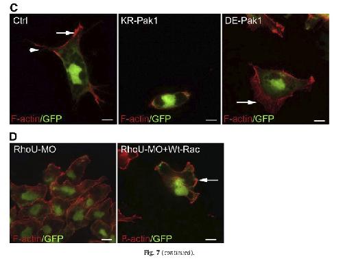 Fig. 7. RhoU controls CNC cell migration through PAK- and Rac-dependent pathways. (C) Analysis of CNC cell protrusions. CNC explants from embryos injected as in (A) were excised at stage 17 and plated on fibronectin-coated substrates. Staining for GFP (green) and F-actin (red) were merged. Arrows indicate lamellipodia and arrowheads filopodia. KR-PAK1 expressing cell shown is representative of 85% observed cells (n = 160). DE-PAK1 expressing cell shown is representative of 69% observed cells (n = 140). Bar, 10 μM. (D) Cells from RhoU-MO or RhoU-MO+ Wt-Rac1 mRNA-injected embryos. GFP (green) and F-actin (red) staining were merged. Arrows indicate lamellipodia. Co-injected cells shown are representative of 56% observed cells (n = 140). Bar, 10 μM. |