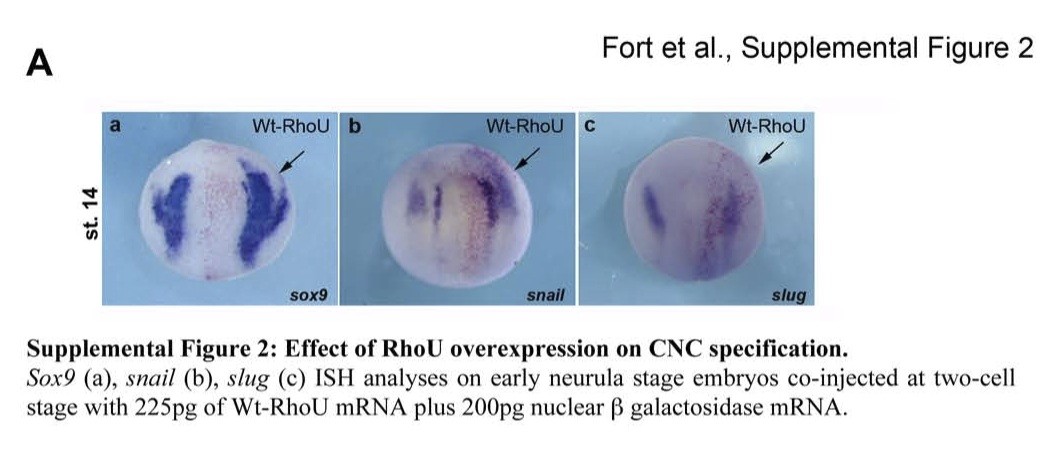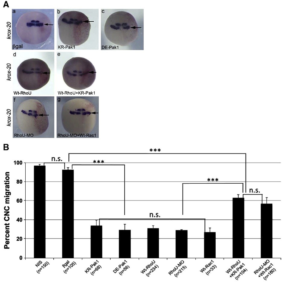 Fig. 7. RhoU controls CNC cell migration through PAK- and Rac-dependent pathways. (A) krox-20 whole-mount ISH analysis. Embryos were injected, fixed at stage 22 and processed for ISH. Embryos were injected with (a) 200 pg nuclear β-galactosidase mRNA (βgal), (b) 400 pg KR-Pak1 mRNA, (c) 200 pg DE-Pak1 mRNA, (d) 225 pg Wt-RhoU, (e) 225 pg Wt-RhoU with 400 pg KR-Pak1 mRNAs, (f) 20 ng RhoU-MO, (g) 20 ng RhoU-MO with 80 pg Wt-Rac1 mRNA. Nuclear β-galactosidase was used as a lineage tracer. Dorsal views, injected sides (red staining) are on the right. (B) Graph summarizing the results of four independent experiments as described in (A). NIS, non-injected-side; n, total number of embryos analyzed. ***(p b 0.001) indicates statistically different conditions. n.s.: not significant. |