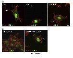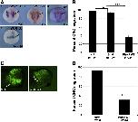 Fig. 5. Wt-RhoU overexpression impairs CNC cell migration. (A) Embryos were injected with nuclear β-galactosidase mRNA (βgal) alone or co-injected with 225 pg Wt-RhoU mRNA and analysed at stage 22. Dorsal views of stage 22 embryos, injected sides (red staining) are on the right. (a) twist, (b) slug and (d) krox-20 stainings on embryos injected with Wt-RhoU. (c) Control slug staining on embryos injected with nuclear β-galactosidase (βgal) mRNA alone. RhoU overexpression induced severe CNC cell migration defects (black arrows). Note that krox-20 expression in the hindbrain was unaffected. (B) Shown is a graph summarizing the results of four independent experiments as described in (A). NIS, non-injected side; β-gal, control side injected with nuclear β-galactosidase mRNA; n, total number of embryos analyzed. *** indicates conditions statistically different (p b 0.001). (C) Embryos were injected with 300 pg GFP mRNA alone or with 225 pg Wt-RhoU and CNC explants were excised as in Fig. 2D. Cells from control GFP grafts exhibited normal migration (white arrow), whereas cells grafts from Wt-RhoU-injected embryos did not migrate properly (white arrowheads). (D) Shown is a graph summarizing the results of four independent experiments as described in (C). GFP, control side injected with GFP mRNA; n, total number of embryos analyzed. *** indicates conditions statistically different (pb0.001). |