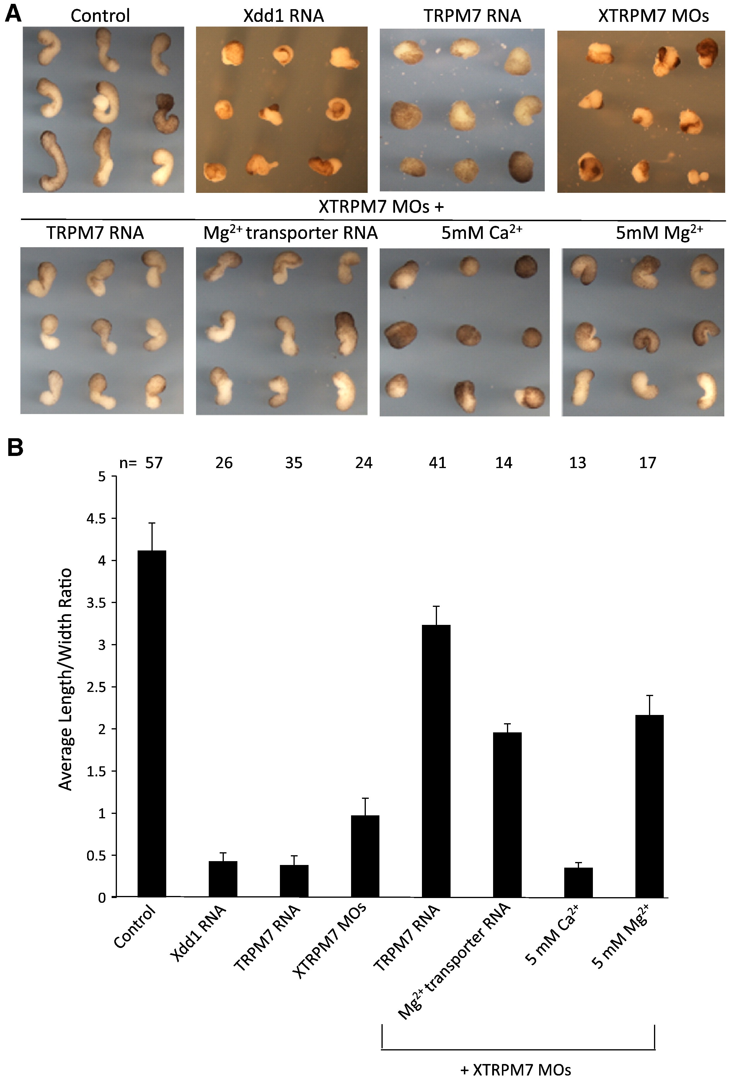 During gastrulation, cells in the dorsal marginal zone polarize, elongate, align and intercalate to establish the physical body axis of the developing embryo. Here we demonstrate that the bifunctional channel-kinase TRPM7 is specifically required for vertebrate gastrulation. TRPM7 is temporally expressed maternally and throughout development, and is spatially enriched in tissues undergoing convergent extension during gastrulation. Functional studies reveal that TRPM7's ion channel, but not its kinase domain, specifically affects cell polarity and convergent extension movements during gastrulation, independent of mesodermal specification. During gastrulation, the non-canonical Wnt pathway via Dishevelled (Dvl) orchestrates the activities of the GTPases Rho and Rac to control convergent extension movements. We find that TRPM7 functions synergistically with non-canonical Wnt signaling to regulate Rac activity. The phenotype caused by depletion of the Ca(2+)- and Mg(2+)-permeant TRPM7 is suppressed by expression of a dominant negative form of Rac, as well as by Mg(2+) supplementation or by expression of the Mg(2+) transporter SLC41A2. Together, these studies demonstrate an essential role for the ion channel TRPM7 and Mg(2+) in Rac-dependent polarized cell movements during vertebrate gastrulation.