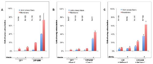 Fig. S2. Quantification of the subcellular localization studies shown in Fig. 2. (A-C) Quantification of Fig. 2A (A), Fig. 2B (B) and Fig. 2C (C). Blue bar indicates transfected cells with localization of GFP or GFP-MIM to actin stress fibers, whereas the red bar indicates localization of GFP or GFP-MIM to the plasma membrane. Sample size (N) is shown above each bar. Error bars indicate standard deviation of the mean. |