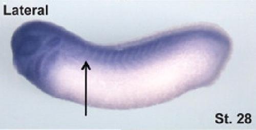 mtss1.2 (metastasis suppressor 1, gene 2) gene expression in Xenopus laevis embryo, assayed via in situ hybridization, NF stage 28, lateral view, anterior left, dorsal up. |