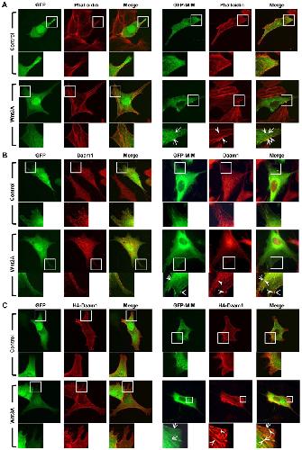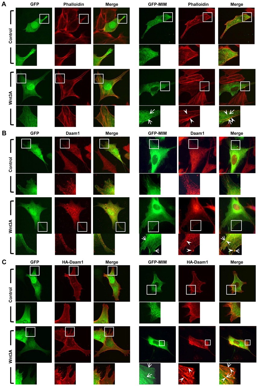 Fig. 2. Wnt stimulation induces co-localization of Daam1 and MIM. (A) GFP-MIM, but not GFP, is localized to actin fibers and the plasma membrane upon Wnt3a stimulation. (B,C) Endogenous Daam1 (B) or HA-Daam1 (C) (red) co-localizes with GFP-MIM, but not GFP, to structures resembling actin fibers (arrowheads) and at the plasma membrane (arrows) upon Wnt3a stimulation. Boxes indicate the regions magnified beneath. Mouse NIH3T3 cells were cultured in the presence of 10% serum and Wnt3a stimulation was for 3 hours. |