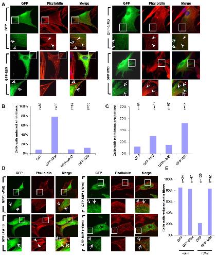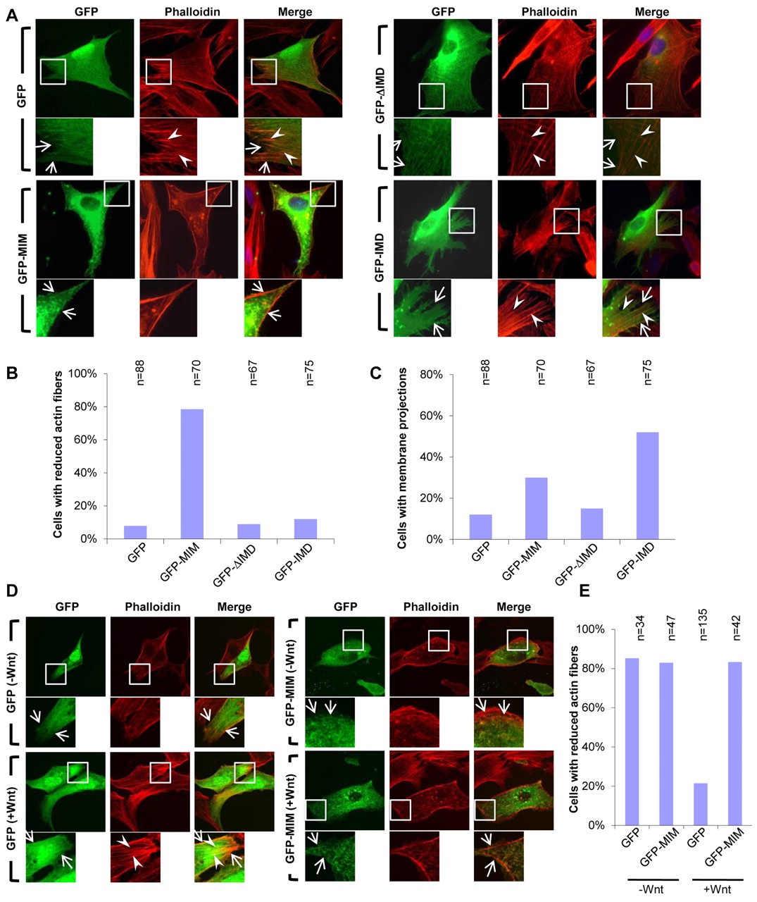 Fig. 3. MIM regulates cellular actin fiber integrity and the formation of membrane protrusions. (A) GFP-MIM, especially GFP-δIMD, strongly co-localizes with Phalloidin-stained actin fibers (red). However, GFP-IMD only partially localized to, or decorated, actin fibers (arrowheads), but induced numerous membranous protrusions (arrows). Cells transfected with GFP were used as controls and transfected cells were cultured in the presence of 10% serum. (B) Quantification of the effects of GFP-MIM, GFP-δIMD and GFP-IMD on the amount of actin fibers within transfected cells. (C) Quantification of the ability of GFP-MIM, GFP-δIMD and GFP-IMD to induce membrane projections within transfected cells. (D) Transfection of GFP-MIM but not GFP inhibits Wnt3a-mediated actin fiber induction. cDNAs were transfected into serum-starved NIH3T3 cells for 24 hours with 3 hours Wnt3a stimulation. (E) Quantification of the results of D. The number of cells analyzed in B, C and E are shown above each bar. |