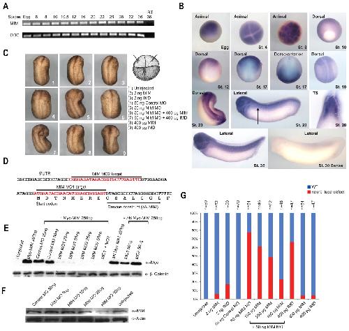 Fig. 4. Temporal and spatial expression pattern of MIM and regulation of anterior neural fold closure by MIM. (A) Xenopus MIM (XMIM) is expressed throughout development as monitored by RT-PCR analysis. ODC is used as a loading control; âRT, without reverse transcriptase. (B) The spatial expression pattern of XMIM is dynamic, with highest expression observed in the neural folds of the neurula stage embryo. Stages and views of the embryos are indicated. No signal is detected using a XMIM sense probe. Arrow indicates the plane of the transverse section (TS). (C) Injection of MIM or IMD RNA produces no morphological defects in the Xenopus embryo, whereas injection of MIM MO (50 ng) dorsally inhibits anterior neural fold closure. The MIM MO phenotype can be effectively rescued by co-injection of 400 pg δN MIM RNA. (D) Location of the MIM MO target sequences; these are absent from the MIM rescue construct (δN MIM), which only includes sequence downstream of the MO1 target. (E) Injection of MIM MO1 or MO2 inhibits translation of Myc-MIM but not of endogenous β-catenin. (F) Injection of MIM MO1 inhibits translation of endogenous MIM but not of endogenous actin in the Xenopus embryo. (G) Quantification of the results of C. The number of injected embryos analyzed is shown above each bar. |