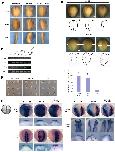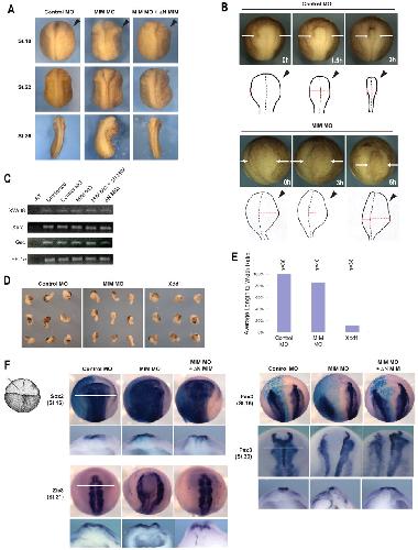 Fig. 5. Depletion of MIM specifically blocks anterior neural fold closure but does not affect convergent extension movements or the expression of mesodermal and anterior marker genes. (A) Time-lapse images of Xenopus embryos injected with control MO (25 ng), MIM MO (25 ng) and MIM MO + δN MIM RNA (25 ng + 400 pg) illustrate that the neural fold on the injected side (arrowheads) fails to close. (B) Measurement of the failure of anterior neural fold closure in MIM MO-injected embryos. Arrows point to the elevated neural fold region (solid black outline in schematic), which moves towards the midline (dashed black line). The solid red line marks the distance between the elevated neural fold region of the uninjected side and the midline, and the dashed red line marks the distance between the elevated neural fold region of the injected side (arrowheads) and the midline. (C) Depletion of MIM does not affect the expression of the mesodermal marker genes XWnt8, Xbra and Gsc in stage 10.5 embryos as analyzed by RT-PCR. EF-1α is used as loading control. (D) Depletion of MIM does not inhibit elongation of Keller explants, whereas dominant-negative Dishevelled (Xdd1, 2 ng) does inhibit elongation. (E) Quantification of Keller explant elongation in D by analysis of the length-to-width ratio of explants. The number of explants analyzed is shown above each bar. (F) Embryos injected dorsally with control MO (50 ng), MIM MO (50 ng) and MIM MO + δN MIM RNA (50 ng + 400 pg) show normal mesodermal and neural gene induction but abnormal tissue localization owing to neural fold elevation and closure defects, as examined by whole-mount in situ hybridization. The MIM MO-injected side is indicated in the accompanying diagram for Sox2, Pax3 and Zic3 staining. The MIM MO phenotype is rescued by co-injection of δN MIM RNA. Sox2- and Pax3-stained embryos were co-injected with lacZ RNA and stained for β-galactosidase (blue) to label the injected side. Sox2 was expressed in a wider region on the injected than the uninjected side (stage 16). Zic3 expression was only affected in the anterior. Pax3 expression was shifted laterally at stages 16 and 19. Solid white lines indicate the position at which embryos were sectioned. |