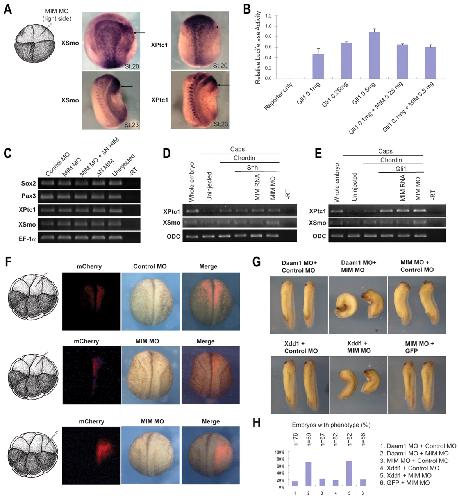 Fig. 6. Depletion of MIM does not affect Hedgehog signaling and MIM synergizes with components of non-canonical Wnt signaling. (A) Depletion of MIM does not inhibit expression of the Hedgehog target genes Patched1 and Smoothened as detected by whole-mount in situ hybridization. Arrows indicate the MIM MO-injected side. (B) Luciferase assays show that transfection of Gli1 into human HEK293T cells dose-dependently activates reporter expression, and that co-expression of MIM with Gli1 does not affect reporter activation. (C) Depletion of MIM does not affect expression of the marker genes Sox2, Pax3, Patched1 (XPtc1) or Smoothened (XSmo) in stage 20 Xenopus embryos as seen by RT-PCR. EF-1α is used as loading control. (D,E) Neuralized Xenopus animal caps (chordin-injected) in the presence of Sonic hedgehog (Shh) (D) or Gli1 (E) express the Hedgehog target genes XPtc1 and XSmo as detected by RT-PCR. Co-injection of MIM RNA or MIM MO does not affect the expression levels of XPtc1 or XSmo. ODC is used as a loading control. (F) Targeted injection was performed into Xenopus dorsal medial animal blastomeres at the 16-cell stage. mCherry RNA (red) was co-injected with control MO, MIM MO and MIM MO + δN MIM RNA as a lineage tracer. Medial injection of MIM MO, but not of control MO, results in an anterior neural fold closure defect and this defect is rescued by co-injection of δN MIM RNA. (G) MIM synergizes with components of the non-canonical Wnt pathway. Ten nanograms of control MO, Daam1 MO or MIM MO or 250 ng of Xdd1 RNA was injected, respectively. Suboptimal doses of Daam1 MO and Xdd1 RNA co-injected with control MO only induced occasional, mild phenotypes, but co-injection of MIM MO with either Daam1 MO or Xdd1 RNA synergistically enhanced both the severity and the frequency of phenotypes. (H) Quantification of the severity of the results illustrated in G. The number of embryos examined is shown above each bar. |