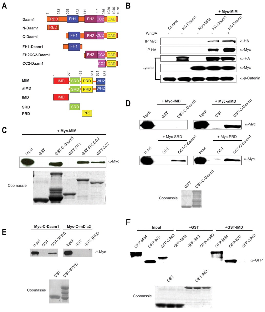 Fig. 1. MIM is a Daam1-interacting protein. (A) Domain structure of Daam1 and MIM constructs. Numbers indicate amino acid positions. RBD, Rho-binding domain; DAD, diaphanous autoregulatory domain. (B) Full-length Daam1 interacts with full-length MIM and is positively regulated by Wnt3a (3 hours of treatment). HA-Daam1 and Myc-MIM constructs were co-transfected into human HEK293T cells and lysates were immunoprecipitated with the indicated antibodies. (C) MIM interacts with C-Daam1, the FH2-CC2 and CC2 domains, but not the FH1 domain, in GST pull-down assays. (D) The δIMD, SRD and PRD, but not the IMD, interact with Daam1. (E) MIM specifically interacts with Daam1 but not with the Formin protein mDia2. (F) MIM self-associates through its IMD. GST pull-down shows that full-length MIM and IMD, but not the δIMD, bind to recombinant IMD protein. For pull-downs, Myc-MIM, IMD, δIMD, SRD and PRD constructs were transfected into HEK293T cells and lysates were isolated. GST and GST-tagged C-Daam1, FH1, FH2-CC2, CC2, SPRD and IMD recombinant proteins were prepared from transfected E. coli BL21 cells. The integrity of GST-tagged proteins is shown by Coomassie staining. |