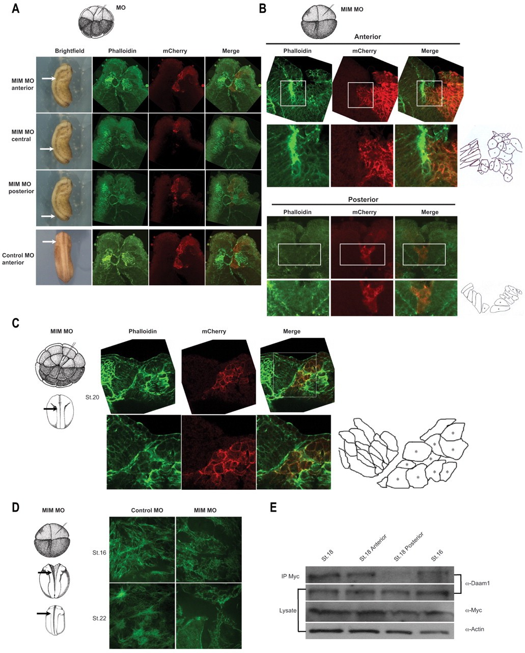 Fig. 7. Depletion of MIM affects anterior neural fold elevation, hinge point formation and apical constriction. (A) MIM depletion inhibits neural fold elevation and closure only in the anterior of the Xenopus embryo. Arrows indicate where sectioning was performed. Transverse sections of a stage 22 embryo show the actin cytoskeleton stained with Phalloidin (green), and mCherry (red) labels cells injected with control MO or MIM MO. Neural fold elevation is only affected in the anterior of the embryo and not in the medial or posterior regions. (B) MIM is required for hinge point formation. In control MO-injected embryos, the anterior neural plate bends at two paired lateral hinge points (not shown). In embryos injected unilaterally with MIM MO, no hinge point forms on the injected (right-hand) side. Actin staining confirms the absence of a hinge point on the MIM MO-injected side (boxed). Drawings illustrate the cell shape on the control MO-injected and MIM MO-injected sides. Asterisks indicate injected side. (C) Strong actin staining is shown on the uninjected side, but no actin accumulation is found on the MIM MO-injected side (boxed). Drawing illustrates the cell shape on the control MO-injected and MIM MO-injected sides. Uninjected cells adopt elongated, polarized morphologies, whereas MIM MO-injected cells are short, round and disoriented. (D) Examination of cells within the anterior neural fold reveals that depletion of MIM inhibits actin fibers, resulting in disrupted morphology. (E) Western blotting shows that MIM preferentially interacts with endogenous Daam1 in the anterior of the embryo. Myc-MIM RNA was injected dorsally and whole embryo or sectioned embryo lysates were isolated at stage 16 and stage 18. |