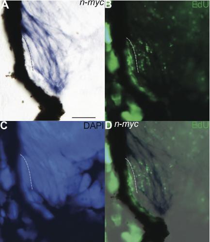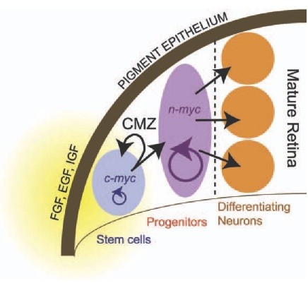 The ciliary marginal zone (CMZ) of fish and frog retinas contains cells that proliferate throughout postembryonic development as the retina grows with increasing body size, indicating the presence of stem cells in this region. However, neither the location nor the molecular identity of retinal stem cells has been identified. Here, we show in Xenopus that c-myc and n-myc are sequentially expressed both during development and in the post-embryonic retina. The c-myc+/n-myc- cells near the extreme periphery of the CMZ cycle more slowly and preferentially retain DNA label compared to their more central cmyc+/n-myc+ neighbors which cycle rapidly and preferentially dilute DNA label. During retinal development c-myc is functionally required earlier than n-myc, and n-myc expression depends on earlier c-myc expression. The expression of c-myc but not n-myc in the CMZ depends on growth factor signaling. Our results suggest that c-myc+/n-myc- cells in the far peripheral CMZ are candidates for a niche-dependent population of retinal stem cells that give rise to more centrally located and rapidly dividing n-myc+ progenitors of more limited proliferative potential. Analysis of homologues of these genes in the zebrafish CMZ suggests that the transition from c-myc to n-myc expression might be conserved in other lower vertebrates whose retinas growth throughout life.
