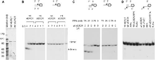 Figure 2. Characterization of xEXO1's nuclease activity. (A) A SDS–PAGE showing the purified recombinant wild-type and mutant xEXO1. (B) Nuclease assay of recombinant xEXO1 with different DNA substrates. The substrates were 48-mer oligonucleotides in either ss- or ds-form attached to magnetic beads, leaving the 5′-end (of the 32P-labeled strand) accessible to the nuclease. After 1 h of incubation at room temperature, the reactions were terminated with 1% SDS, heated at 95°C for 15 min, and then separated on an 8% TAE–PAGE. (C) Effect of RPA on the 5′→3′ exonuclease activity of xEXO1. Different amounts of RPA and xEXO1 were incubated with the 32P-labeled 5′ accessible ss- or ds-48-mer beads for one hour at room temperature. The analysis was similar to that in (A). (D) Determination of the 3′→5′ exonuclease activity of xEXO1. Four microliters of xEXO1 was incubated with 32P-labeled 3′ accessible ss- or ds-48-mer beads in the presence or absence of RPA (75 nM) at room temperature for 1 h. The analysis was similar to that in (A).