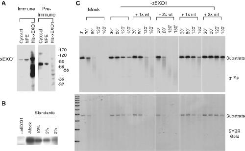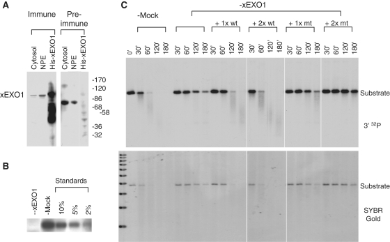 Figure 3. Effect of xEXO1 on 5′-strand processing. (A) Detection of xEXO1 in cytosol and NPE by western blot with anti-xEXO1 bleed (immune) and pre-bleed (pre-immune). (B) Efficiency of xEXO1 depletion. The quantitation standards for western blot were untreated cytosol at different amounts relative the depleted cytosol. (C) Effect of xEXO1 depletion on 5′-strand processing. 3′-32P-labeled linear pBLP DNA with ddC-blocked ends (1 ng/µl) was incubated in xEXO1-depleted or mock-depleted cytosol. Four additional reactions of xEXO1-depleted cytosol were supplemented two different levels of wild-type (wt) and mutant (mt) recombinant xEXO1. Samples taken at the indicated times were treated with SDS–proteinase K and separated on 1% TAE–agarose gel. The gel was stained with SYBR Gold and then dried for exposure to an X-ray film.