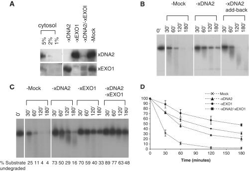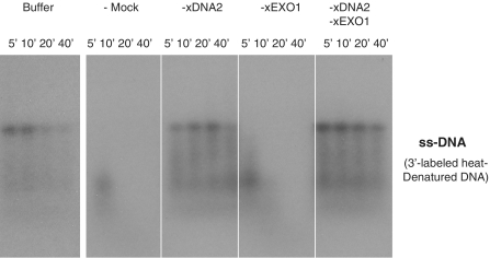 Figure 5. Effect of xEXO1 and xDNA2 on 3′-labeled ssDNA degradation. Linear ss-pBS DNA (2 ng/µl) labeled with 32P at the 3′-end was incubated in the indicated depleted cytosol or buffer. Samples taken at the indicated times were treated with SDS–proteinase K, separated on a 1% TAE–agarose gel, and detected by exposure to an X-ray film.
