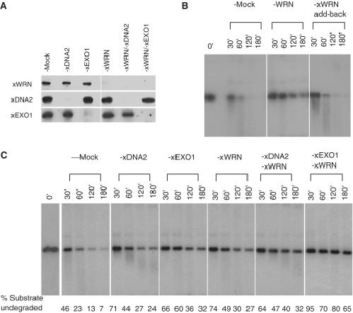 Figure 6. Effect of xEXO1 and xWRN co-depletion on 5′-strand processing. (A) Western showing the depletion of xEXO1, xWRN, and xDNA2. (B) Effect of xWRN single depletion on 5′-strand processing. The 3′-32P-labeled linear pBLP DNA with ddC-blocked ends (1 ng/µl) was incubated in mock-depleted cytosol or xWRN-depleted cytosol (supplemented with either buffer or the purified xWRN). Time points were treated with SDS–proteinase K and analyzed on a 1% TAE–agarose gel. (C) Effect of xEXO1-xWRN and xDNA2-xWRN double depletions on 5′-strand processing. Cytosol depleted of the indicated proteins were incubated with the 3′-32P-labeled and ddC-blocked linear pBLP (1 ng/µl). The reactions were treated and analyzed similarly to that in (B). The percentage of remaining DNA substrate was calculated relative to the total input DNA.