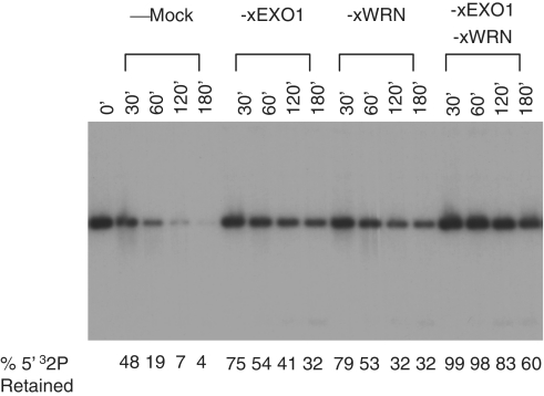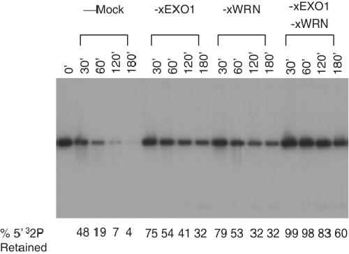 Figure 7. Effect of xEXO1 and xWRN on the initiation of 5′-strand processing. The 5′-32P-labeled linear pBLP DNA with ddC-blocked ends (1 ng/µl) was incubated with cytosol depleted of the indicated proteins. Samples were taken at the indicated times, treated with SDS–proteinase K, and analyzed by a 1% TAE–agarose gel. The percentage of 5′-32P-label retained on the substrate was calculated relative the total input.