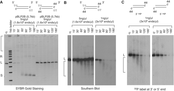 Figure 1. Establishment of cytosol as a system for studying 5′- strand processing. (A) A dideoxynucleotide at the 3′-end blocks NHEJ. A 5.7 kb linear DNA (pBLP) with either dC or ddC at the 3′- end was incubated in cytosol at 5 ng/µl. Samples were taken at the indicated times, treated with SDS–proteinase K and separated on a 1% TAE–agarose gel. DNA was detected by SYBR Gold staining. L: linear substrate. S: supercoiled monomer product. Bracket: dimers, trimers and multimers. (B) Effect of DNA concentration on 5′-strand processing. DNA with ddC-terminated 3′-ends was incubated in cytosol at 5 ng/µl and 1 ng/µl concentrations. Samples were processed as in (A), transferred to a Nylon membrane, and detected by Southern hybridization with a 32P-labeled probe. L: liner substrate. Bracket: intermediates. (C) Differential fate of 5′- and 3′ 32P-label during 5′ strand processing. 5′- or 3′-labeled DNA with ddC-terminated 3′-ends was incubated in cytosol for the indicated times and separated by gel electrophoresis as in (A). The gel was dried and the 32P signal was detected by exposure to an X-ray film.