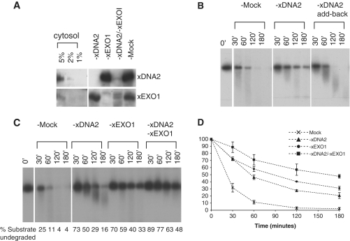 Figure 4. Effect of xEXO1 and xDNA2 co-depletion on 5′-strand resection. (A) Efficiency of xEXO1 and xDNA2 depletion. The quantitation standards for western blot were untreated cytosol at different amounts relative the depleted cytosol. (B) Effect of xDNA2 single depletion on 5′-strand processing in cytosol. The 3′-32P-labeled linear pBLP DNA with ddC-blocked ends (1 ng/µl) was incubated in mock-depleted cytosol or xDNA2-depleted cytosol (supplemented with either the ELB buffer or the purified xDNA2). Samples were taken at the indicated times, treated with SDS–proteinase K and analyzed on a 1% TAE–agarose gel. (C) Effect of xEXO1 and xDNA2 double depletion on 5′-strand processing. Cytosol depleted of the indicated proteins was incubated with the 3′-labeled ddC-blocked linear pBLP (1 ng/µl). Samples taken at the indicated times were treated with SDS–Proteinase K, separated on an 1% TAE–agarose gel, transferred to a Nylon membrane, and detected by Southern hybridization with a 32P-labeled probe. (D) Plot of the substrate remaining at the indicated times after incubation in the various depleted extract. The averages and standard deviations were derived from three sets of data.