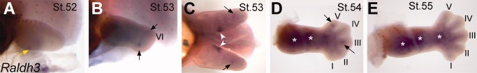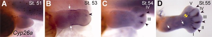Figure 3. Cyp26a is expressed interdigitally during mid to late limb development. Dark blue stain indicates expression, roman numerals indicate digit identity. AâD:Cyp26a expression in hindlimbs at stages 51 to 55. A:Cyp26a is not expressed at st. 51. B: At st. 53, a diffuse staining can be seen in the distal 2/3 of the limb, with the proximal limit marked by white arrows. C: At st. 54 Cyp26a is expressed between digits IV and III and III and II, marked by black arrowheads. D:Cyp26a is expressed between all five digits at st. 55 (black arrowheads), in two stripes at the base of each forming digit (yellow arrows), and in two stripes in the anterior limb (white arrows). |
