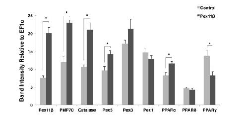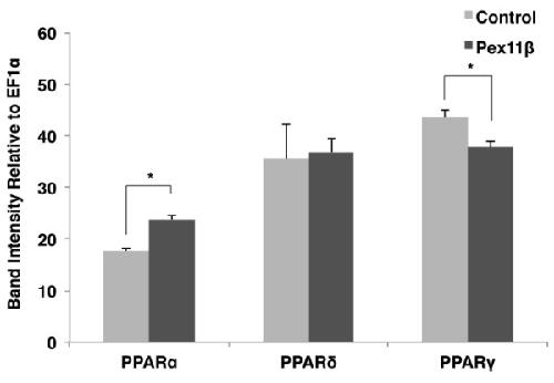 Figure 1. Overexpressing HA-Pex11β altered peroxisome related gene expression in Xenopus A6 cells. RT-PCR analysis of peroxisomal genes was performed before and after transfection of A6 cells with HA-Pex11β. Two days following transfection 250 ng of reverse-transcribed A6 cell RNAs from control and treatment samples (n = 3) were subject to PCR amplification using specific primers for the peroxisome related genes; Pex11β, PMP70, catalase, Pex5, Pex3, Pex1, PPARα, -δ, and -γ. The respective mRNA levels represent measures of mid-log phase RT-PCR product band intensities, relative to levels of EF1α. Genes whose levels were altered significantly, as assessed by an independent samples t-test, are denoted with an asterisk. Pex11β, PMP70, catalase, Pex5 and PPARα displayed elevated levels of expression following treatment, while PPARγ displayed reduced expression. P < 0.05, n = 3. Values presented are the means ± SE. |