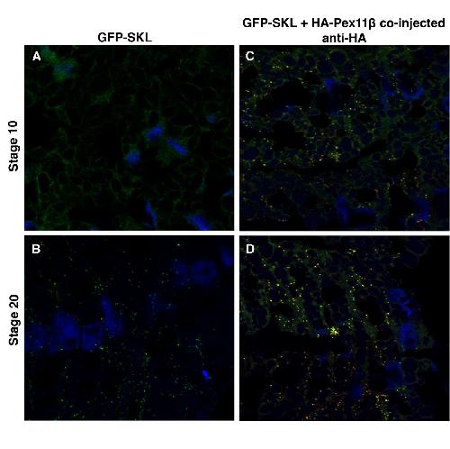 Figure 7. Microinjecting HA-Pex11β RNA increased catalase immunofluorescence levels during X. laevis embryogenesis. Both control (A and B) and HA-Pex11β injected (C and D) embryos at developmental stages 10 (A and C) and 20 (B and D), were fixed then sectioned for immunohistochemical analysis in somites for catalase. At stage 10 catalase protein is undetected in somitic mesoderm under control conditions (A), whereas following microinjection of HA-Pex11β catalase protein is detectable in punctate structures (C). At stage 20, PMP70 protein was detected in both control and following microinjecting HA-Pex11β (B and D). An HA antibody was also used to confirm the ectopic presence of HA-Pex11β. DAPI (blue), PMP70 (green), HA-Pex11β (red), colocalization of HA-Pex11β and PMP70 (yellow). Images were taken at 60magnification.