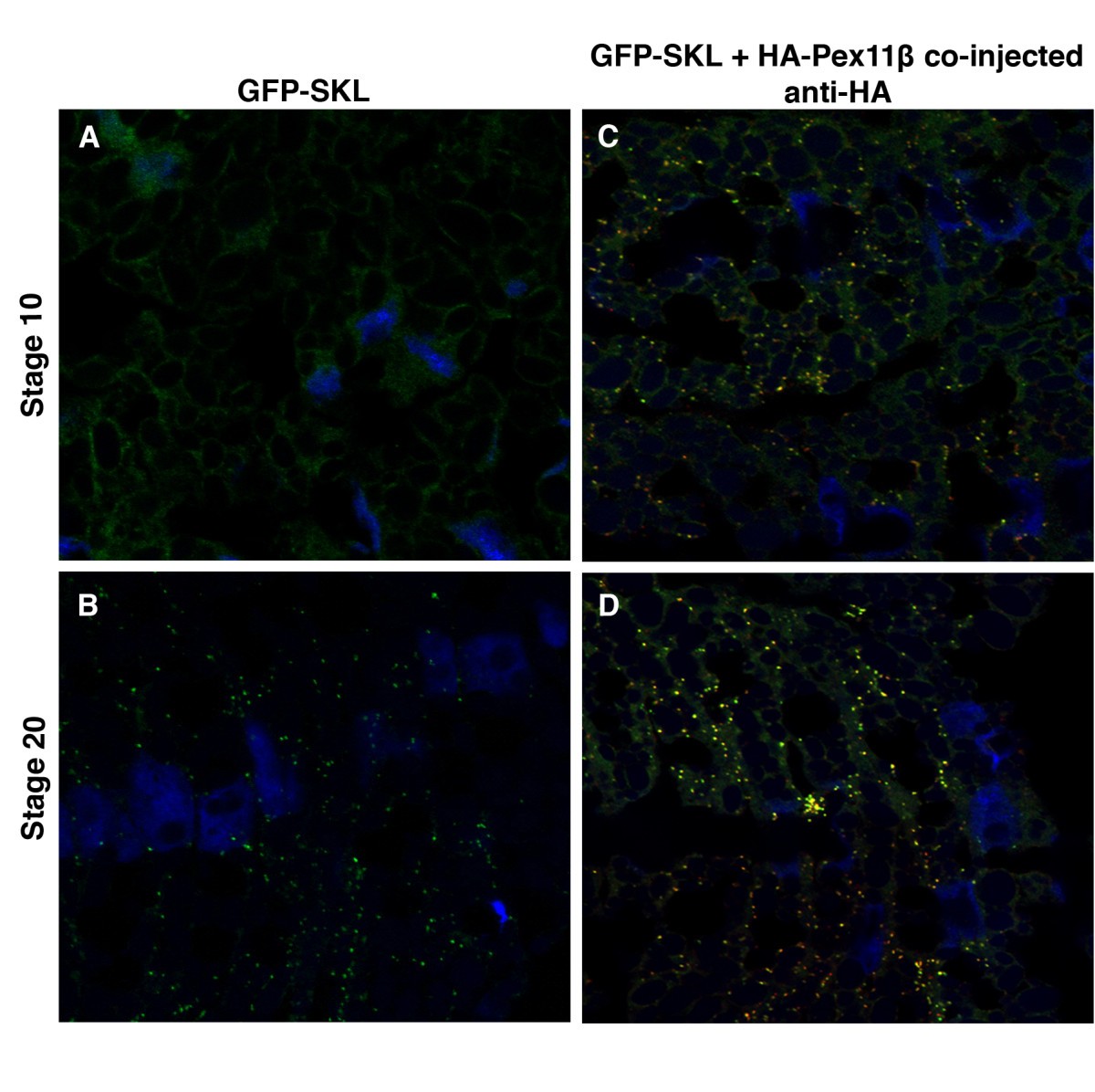 Figure 8. Microinjecting HA-Pex11β RNA increased the number of peroxisome-like GFP-SKL structures during X. laevis embryogenesis. Both control (A and B) and HA-Pex11β injected (C and D) embryos at developmental stages 10 (A and C) and 20 (B and D), were fixed then sectioned for immunohistochemical analysis in somites for GFP-SKL. At stage 10, GFP fluorescence is present as a faint diffuse stain under control conditions (A), whereas following microinjection of HA-Pex11β punctate GFP structures could be seen at this early stage (C). At stage 20, punctate GFP structures were detected in both control and following microinjecting HA-Pex11β, where numbers were increased in the injected samples. An HA antibody was also used to confirm the ectopic presence of HA-Pex11β. DAPI (blue), GFP (green), HA-Pex11β (red), colocalization of HA-Pex11β and GFP-SKL (yellow). Images were taken at 60magnification. |