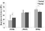 Figure 5. Overexpression of HA-Pex11β did altered PPARα and γ, but not δ, gene expression during early X. laevis embryogenesis. The respective mRNA levels represent measures of mid-log phase RT-PCR product band intensities, relative to levels of EF1α. Using a similar approach and analysis as used in Figure 4, RT-PCR analysis of RNA isolated from control stage 10 embryos and HA-Pex11β injected embryos revealed significant changes in the expression of PPARα, and PPARγ, but not PPARδ. PPARα levels were elevated by treatment, while PPARγ levels were reduced. P < 0.05, n = 3. Values presented are the means ± SE. |