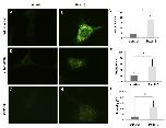 Figure 3. Overexpression of HA-Pex11β in A6 cells increased peroxisome numbers. A, D, G are untransfected cells, while B, E, H have been transfected with HA-Pex11β. G and H are additionally transfected with GFP-SKL. Using identical imaging and photography parameters, indirect immunofluorescence using a catalase antibody revealed lower levels of immunofluorescence in untransfected cells (A) versus transfected (B) cells. Similarly, indirect immunofluorescence using a PMP70 antibody revealed lower levels of signal in untransfected cells (D) versus transfected (E). Direct fluorescence for GFP revealed a diffuse signal from GFP in HA-Pex11β untransfected cells, (G) versus the presence of punctate structures in HA-Pex11β transfected cells (H). All images were captured using identical fluorescent settings. The relative fluorescence intensity in 10 regions of twenty randomly imaged cells was quantified using Northern Eclipse software. Graphs on the right represent the average fluorescence intensity of untransfected versus HA-Pex11β transfected cells. Values presented are the means ± SE. Significance at P < 0.05 was determined using Student's t-test, n = 25. |