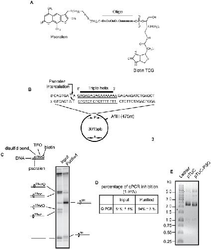 Figure 1. TFO and purification of monomodified plasmid.(A) Structure of the TFO linked in 3′ to 4, 5′, 8-trimethylpsoralen and in 5′ to biotin. (B) Localization of the TFO binding site and position of the psoralen ICL on pTUC plasmid. P and A are schematic representations of primers for q-PCR used in (D). P primers surround the psoralen ICL site and amplify a region of 113 nt, the A primers amplify an undamaged regions of 129 nt. (C) Analysis of the crosslinked plasmid after UV irradiation and before (input) or after (purified) DTT elution from a strepatvidin column. DNA was digested with BamHI + EcoRI and radioactively labelled before electrophoresis on a 10% polyacrylamide denaturing gel. Interpretative diagrams of the relevant molecular species are shown on lane sides. (D) Input and purified plasmids were subjected to q-PCR with primers P and A. Mean values of 3 q-PCRs for the input and 12 q-PCRs for the purified plasmid are presented. For calculation details see Material and Methods. (E) After purification pTUC-PSO was analyzed on a 0.8% agarose gel TBE 1x alongside with control plasmid and a molecular weight ladder.