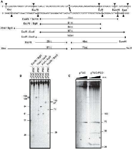 Figure 3. Replication fork leading strands progress up to the psoralen crosslink.(A) Sequence of the plasmid around the psoralen ICL with restriction sites used in B and C. Double arrows indicate the size of the replicated strands (lagging or leading) spanning the ICL site for the control or repaired plasmid. Single arrows indicate the progression of the leading strand to the ICL for the crosslinked plasmid. The strand size is shown above each product. (B) Mapping of leading strand progression for pTUC and pTUC-PSO after 65 min of incubation in Xenopus egg extracts in the continuous presence of [α-32P]-dATP. Plasmids were digested by the indicated enzymes and analyzed on 10% polyacrylamide denaturing gel. Faint bands visible in lanes 3 and 4 likely result from a star activity of Sac II. The two 28 nt size indicators are at two different positions due to gel smiling. (C) Mapping of leading strand progression for pTUC and pTUC-PSO at 25, 35, 50, 65, 85, 95, 120 and 180 min. Plasmids were digested with EcoRI and BamHI and subjected to migration on a 10% polyacrylamide denaturing gel. 28 nt and 46 nt fragments correspond to the DNA size expected for the leading strand arriving at the psoralen from the EcoRI side or BamHI side, respectively.
