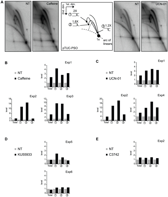 Figure 4. Effect of ATR and Chk1 inhibition on processing of stalled replication forks at the psoralen ICL.(A) pTUC-PSO was incubated for 95 min in a Xenopus egg extract in absence (NT; not treated) or presence of 5 mM caffeine or 10 µM UCN-01 and [α-32P]-dATP and analyzed on 2D gels. Total signal and spots 1, 2 and 3 (as labeled on the interpretative diagram) were quantified in the presence of caffeine (B), UCN-01 (C), KU55933 (D) or C3742 (E). Results were normalized to the signals obtained with the non-treated plasmid. Exp1, Exp2, Exp3, Exp4, Exp5 and Exp6 are six experiments in six independently prepared egg extracts.